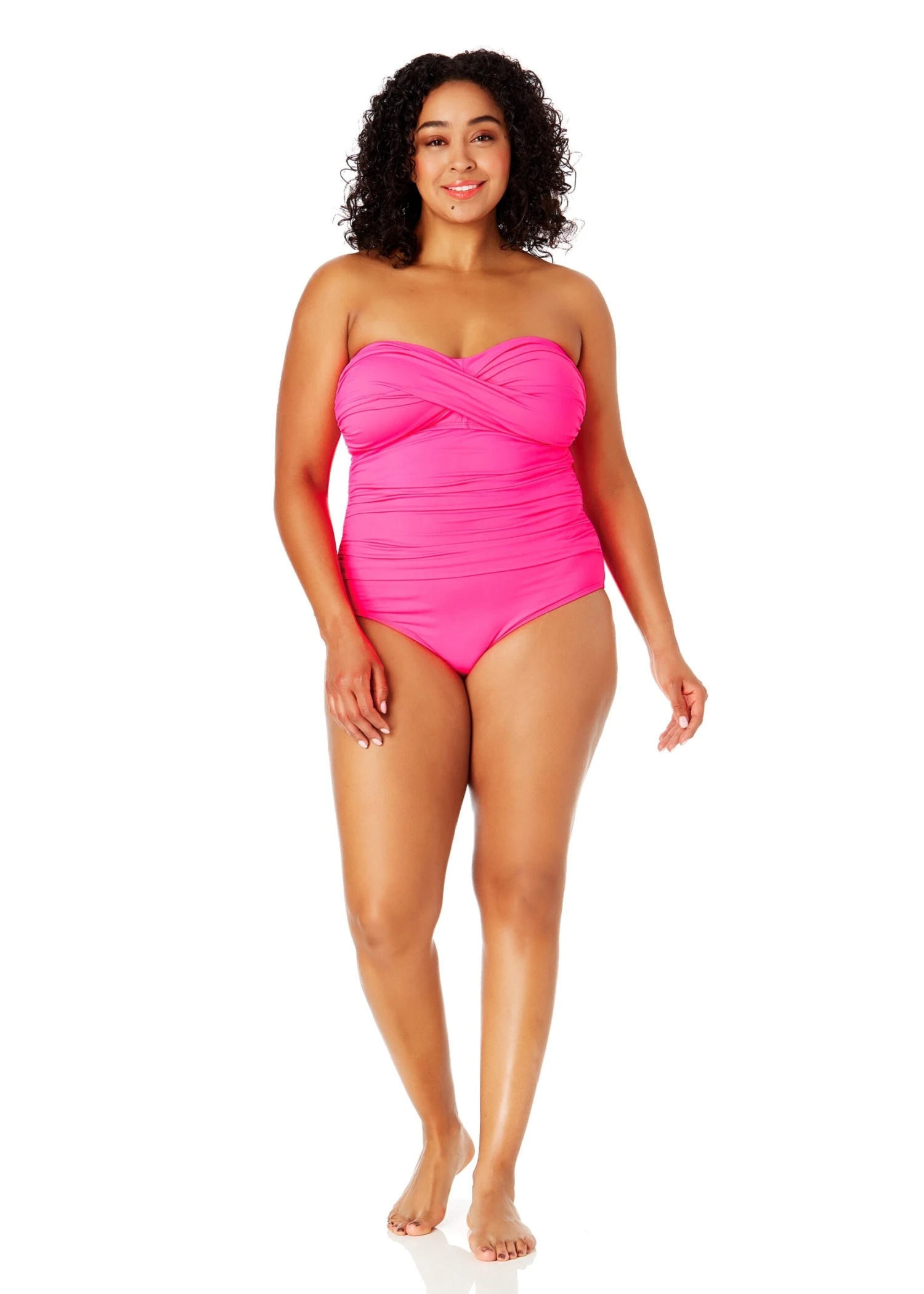 Feel elegant and sophisticated in our Plus Size Live In Color Twist Front Shirred One Piece Swimsuit. This plus size one piece’s vibrant color is perfect for making a statement at the beach. Adjustable, removable straps, built-in boning, and shirred details create a flattering fit for your figure. This one piece swimsuit is also designed with a twisted front, adding an elegant detail to your look. Add any Anne Cole cover up to complete your beach look!