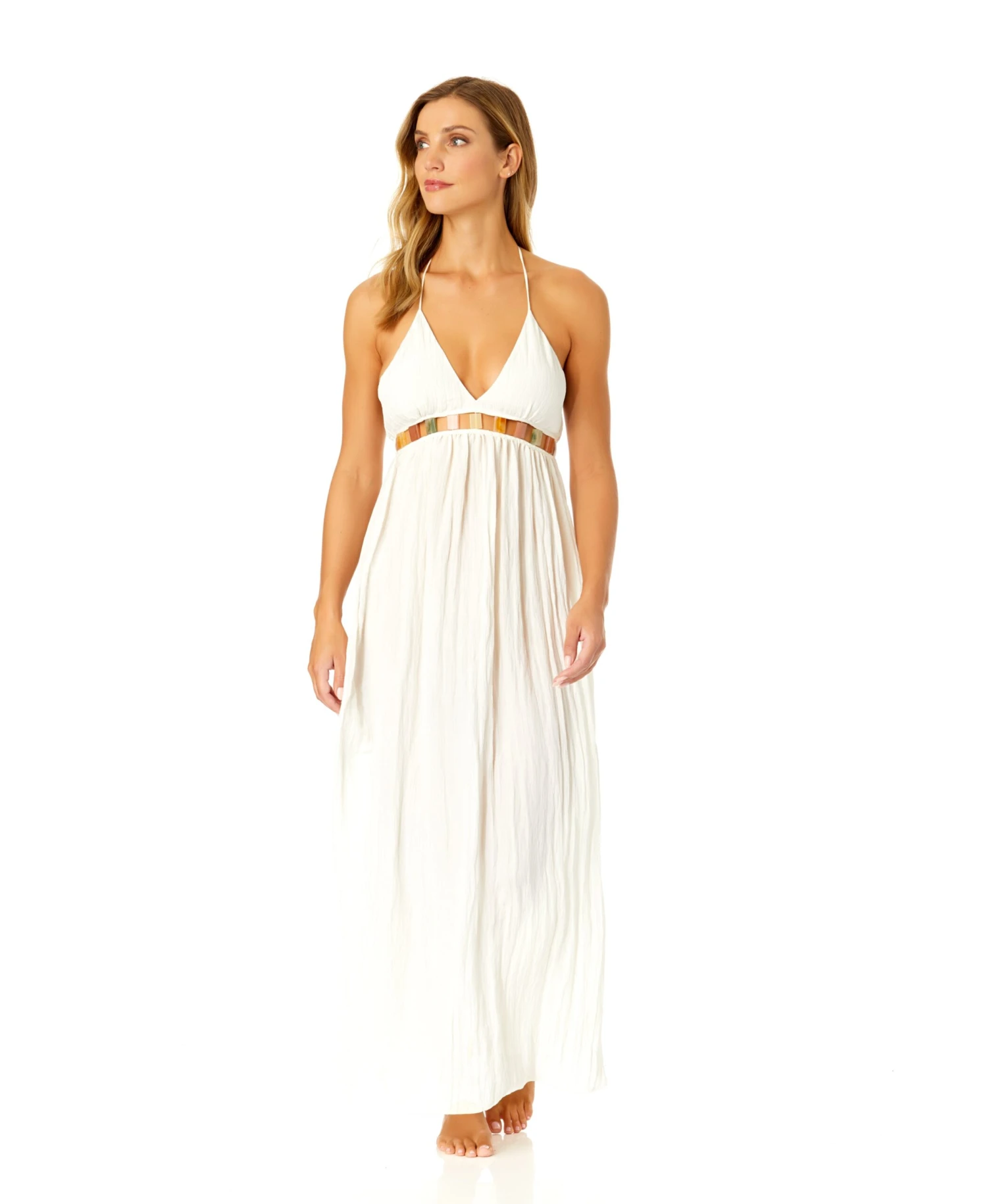Our V Neck Jewel Maxi Dress With Spaghetti Straps Cover Up will take you effortlessly from beach to boardwalk. Designed with a deep V-neckline and slim spaghetti straps, this dress beautifully frames the shoulders and collarbone. The colorful jewel detailing at the underbust creates a striking accent, drawing the eye to the silhouette. A flowing maxi length offers airy coverage, perfect for warm, breezy days. Wear it alone Layer it over your favorite Anne Cole swimsuit and add simple summer accessories for an elegant yet relaxed, coastal vibe.